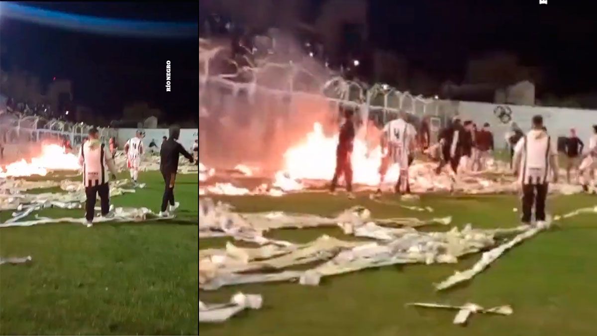 Por su parte, los simpatizantes de Cipolletti rompieron el alambrado y saltaron al campo de juego para descolgar las banderas que estaban atadas y evitar un riesgo mayor, ya que el fuego crecía rápidamente. Con la ayuda de extintores, pudieron apagar el fuego después de cinco minutos.