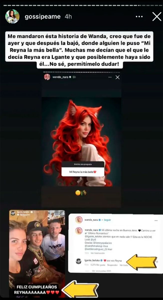 Si hay una cuenta que se la pasa detrás de todo lo que la pasa a los artistas es la cuenta gossipeame. “Me mandaron esta historia de Wanda, creo que fue de ayer y que después la bajó, donde alguien le puso 'Mi Reyna la más bella'”, y si hacemos un poquito de memoria y nos remontamos meses atrás; así le decía el cantante de "Cumbia 420".