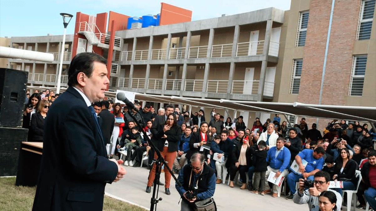 El gobernador realizó el corte de cintas y luego acompañó a los adjudicatarios Romeo Chiaraviglio y Melina Ceratto a su nuevo hogar, a quienes entregó las llaves y documentación.