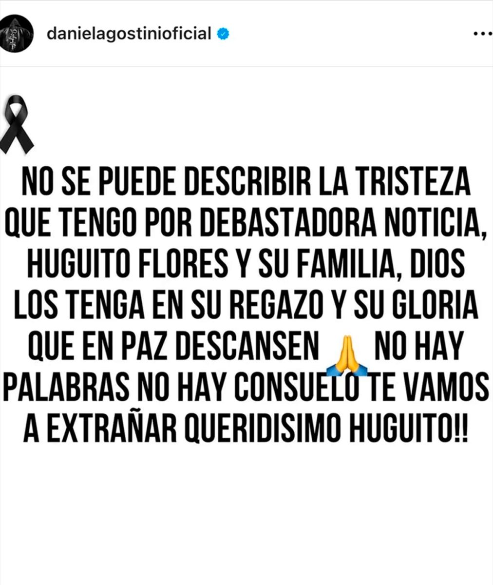 Además, Rodrigo Tapari se expresó en homenaje a su colega. “Descansá en paz Hugo Flores”, escribió. Y Daniel Agostini fue otro que se mostró conmovido y angustiado por la muerte. “No se puede describir la tristeza que tengo por esta devastadora noticia, Huguito y su familia, Dios los tenga en su regazo y su gloria. Que en paz descansen. No hay palabras de consuelo, te vamos a extrañar muchísimo queridísimo Huguito”, concluyó emocionado.