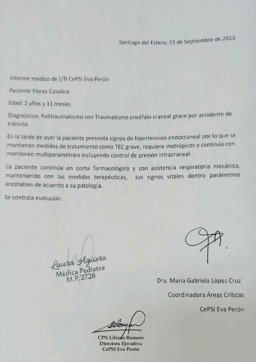 Desde el CEPSI indicaron que Catalina Flores continúa internada y en coma farmacológico, aunque sus signos vitales son estables.