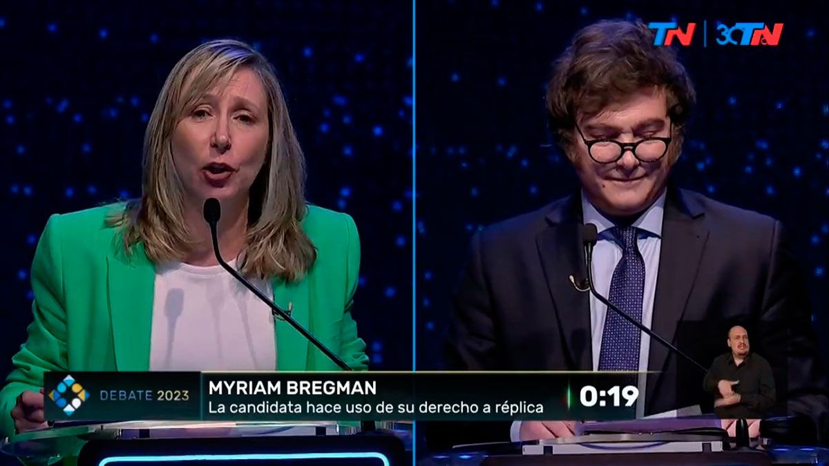 Javier Milei y Miryam Bregman protagonizaron uno de los primeros cruces en el debate presidencial. Después de la presentación de cada candidato, la representante de la Izquierda pidió el derecho a réplica y atacó directamente al libertario.