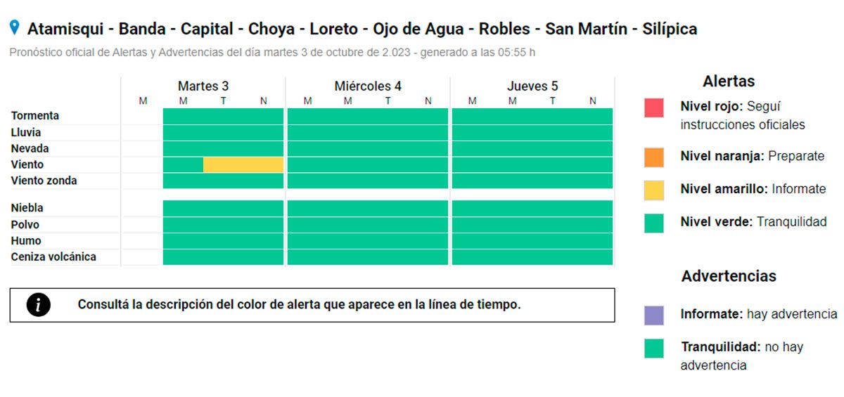 Durante la mañana de este martes, el Servicio Meteorológico Nacional emitió una alerta amarilla para diversas localidades en Santiago del Estero por vientos fuertes.