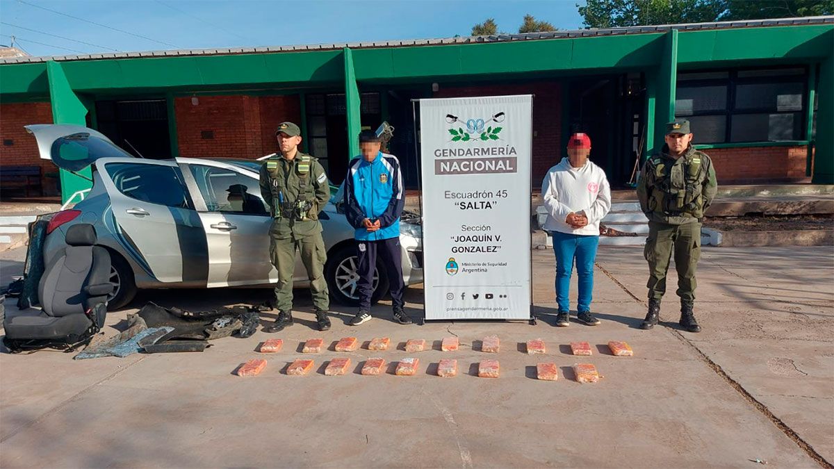 Dos personas fueron detenidas con casi 19 kilogramos de cocaína ocultos debajo de la alfombra del automóvil en el que se trasladaban por la provincia de Salta, informaron hoy fuentes de la Gendarmería Nacional (GNA).