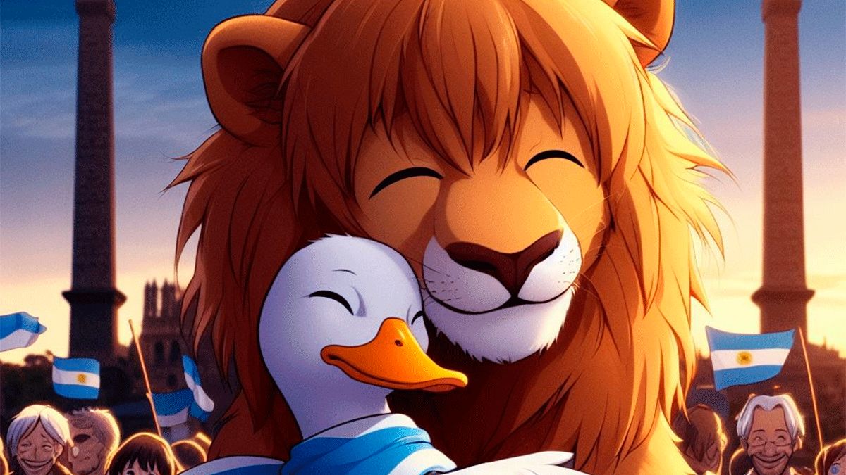 Mientras la presidente del PRO hablaba en conferencia de prensa, el líder libertario hizo un curioso posteo en redes sociales: una foto de un pato y de un león simpático abrazados. Detrás de ellos, personas con banderas y remeras de la Argentina.