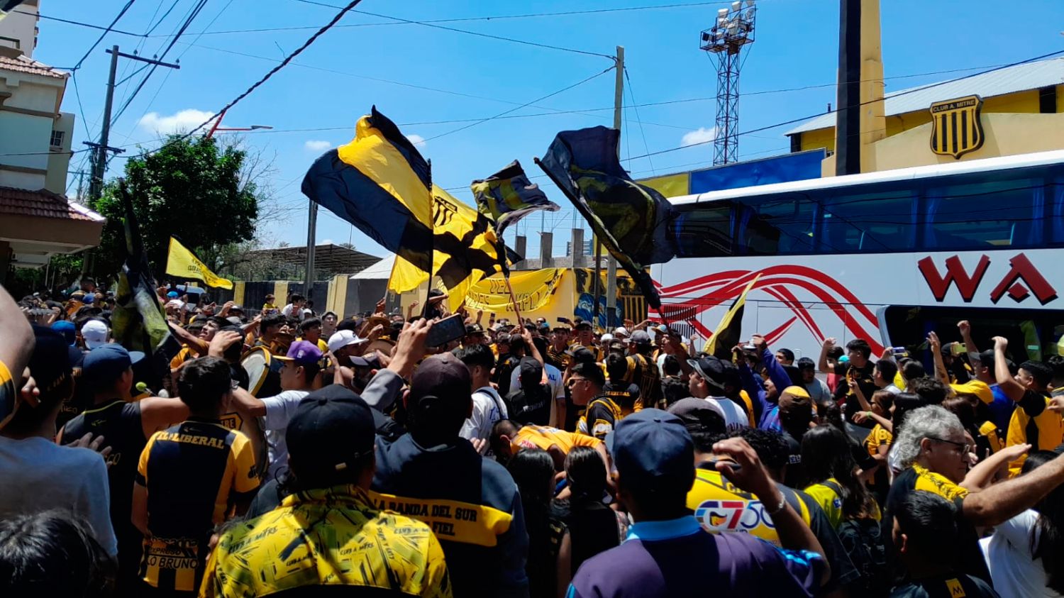 Los hinchas del Aurinegro están exaltados y se acercaron a las instalaciones del club para alentar a sus jugadores con un banderazo en la puerta del estadio Drs. José y Antonio Castiglione, en la intersección de Roca y 3 de Febrero.