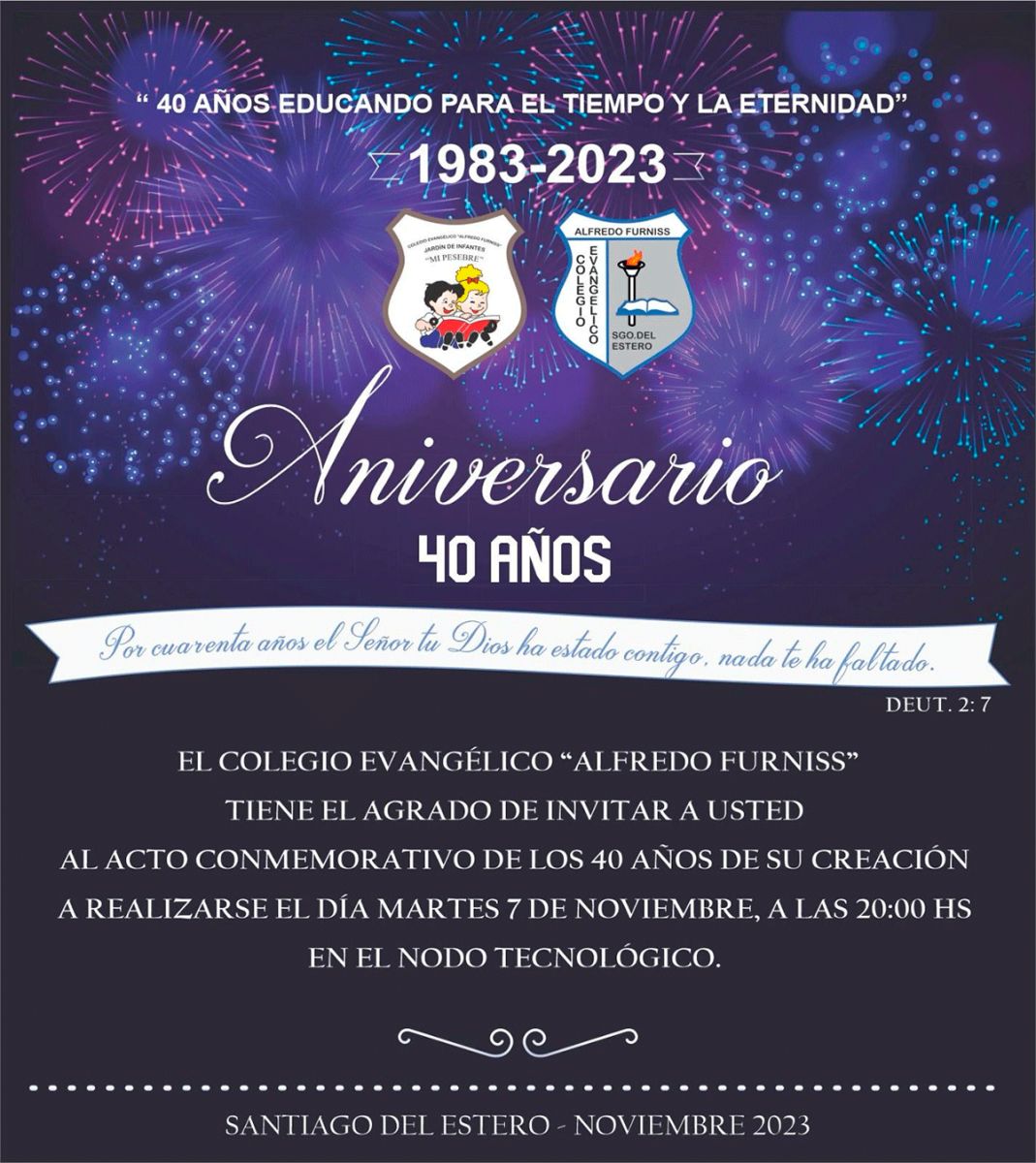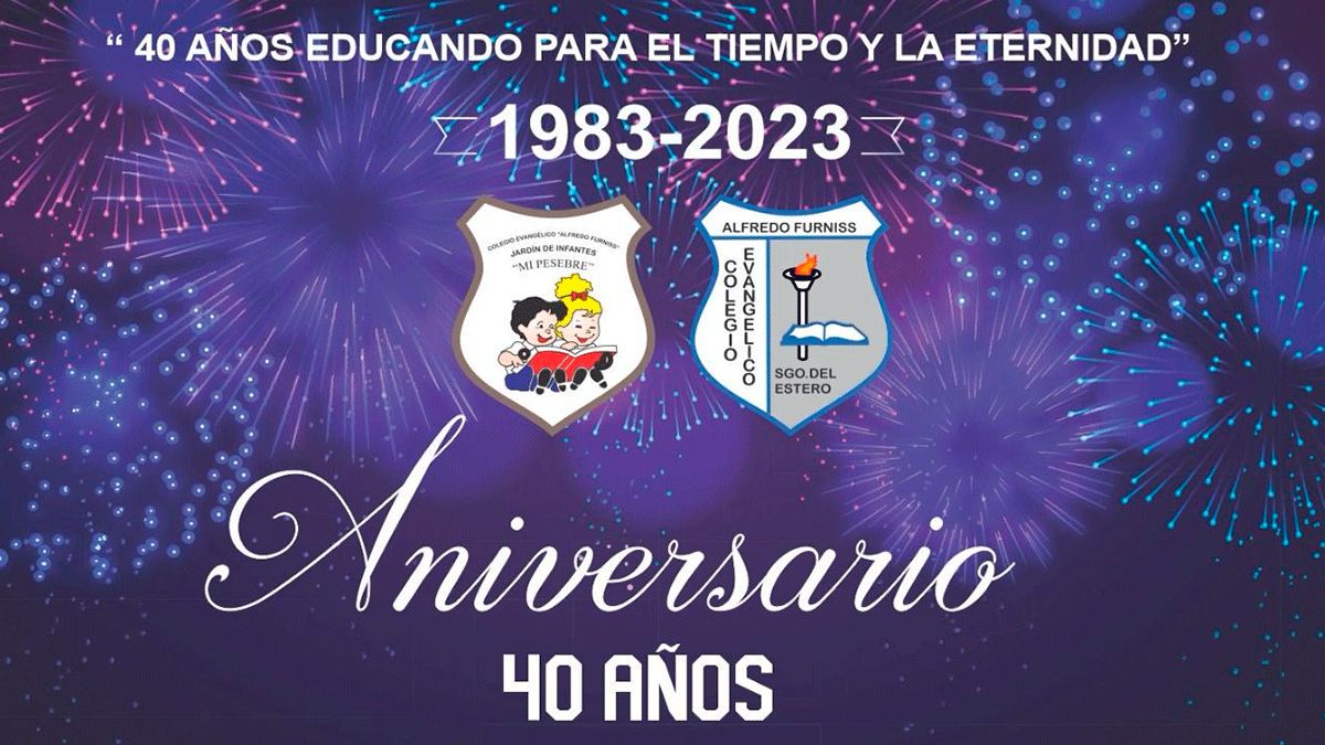 El Colegio Evangelico “Alfredo Furniss” invita a alumnos, docentes y egresados del Nivel Primario y Secundario, como así también del Nivel Inicial del Jardín de Infantes “Mi Pesebre”, a presenciar el acto en conmemoración por su 40º aniversario.