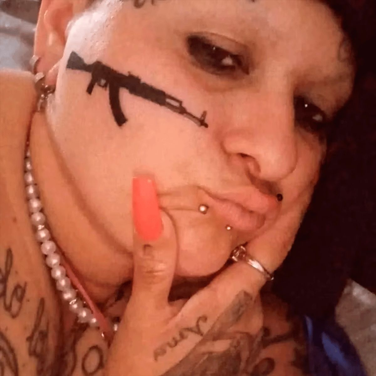 La joven oriunda de San Pedro se dibujó un rifle. Se trata del modelo AK 47, un fusil de asalto soviético, de calibre 7,62 mm, diseñado por Mijaíl Kaláshnikov en la Segunda Guerra Mundial. “Miren mis vagancias del barrio, para el mundo pintó tattoo nuevo en mi cara, al mejor estilo”, expresó contenta.