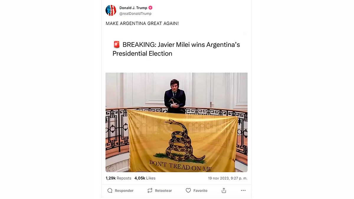 “MAKE ARGENTINA GREAT AGAIN!” (¡HAGAMOS A ARGENTINA GRANDE OTRA VEZ!), escribió el ex mandatario Donald Trump en su propia red social, Truth, donde se refugió cuando lo expulsaron de Twitter.