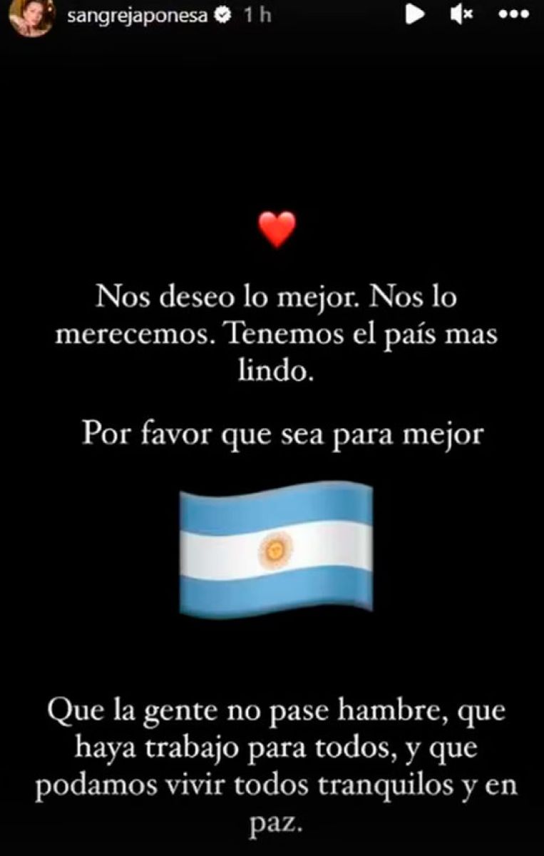 “Nos deseo lo mejor. Nos lo merecemos. Tenemos el país más lindo”, manifestó La China en su cuenta de Instagram. “Por favor, que sea para mejor”, remarcó y agregó una bandera de Argentina, la cual se destacaba del fondo negro que eligió.