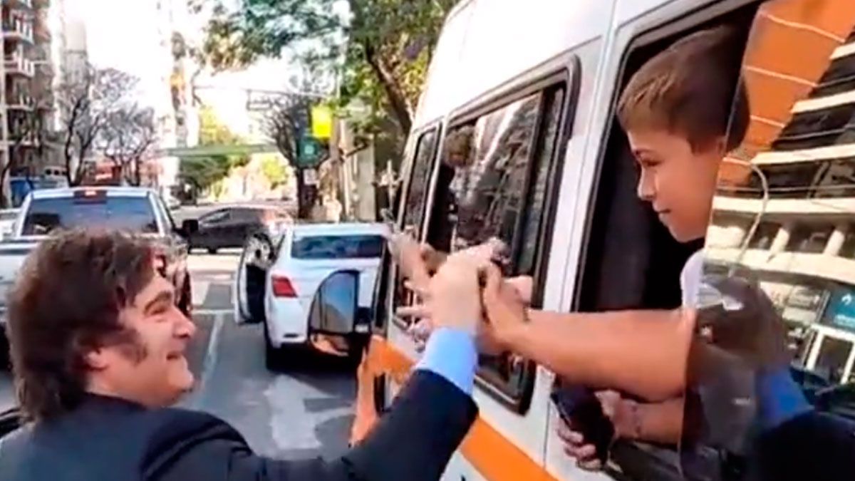 La secuencia se produjo cuando el vehículo que trasladaba a Milei se detuvo al lado de una combi escolar. Entonces, el presidente electo saludó por la ventanilla a los alumnos que iban a bordo del segundo rodado, quienes le devolvieron el gesto con euforia. Ante dicha reacción, el economista no lo dudó: abrió la puerta y les extendió la mano a varios de los chicos que se estiraban para tocarlo desde la camioneta.