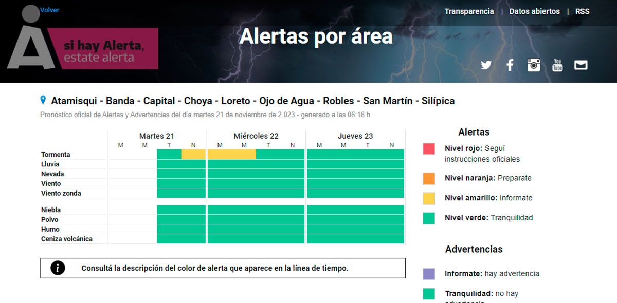 El Servicio Meteorológico Nacional (SMN) emitió un alerta amarillo por tormentas que afectarán en especial los departamentos Capital, Banda, Atamisqui, Choya, Loreto, Ojo de Agua, Robles, San Martín y Silípica.