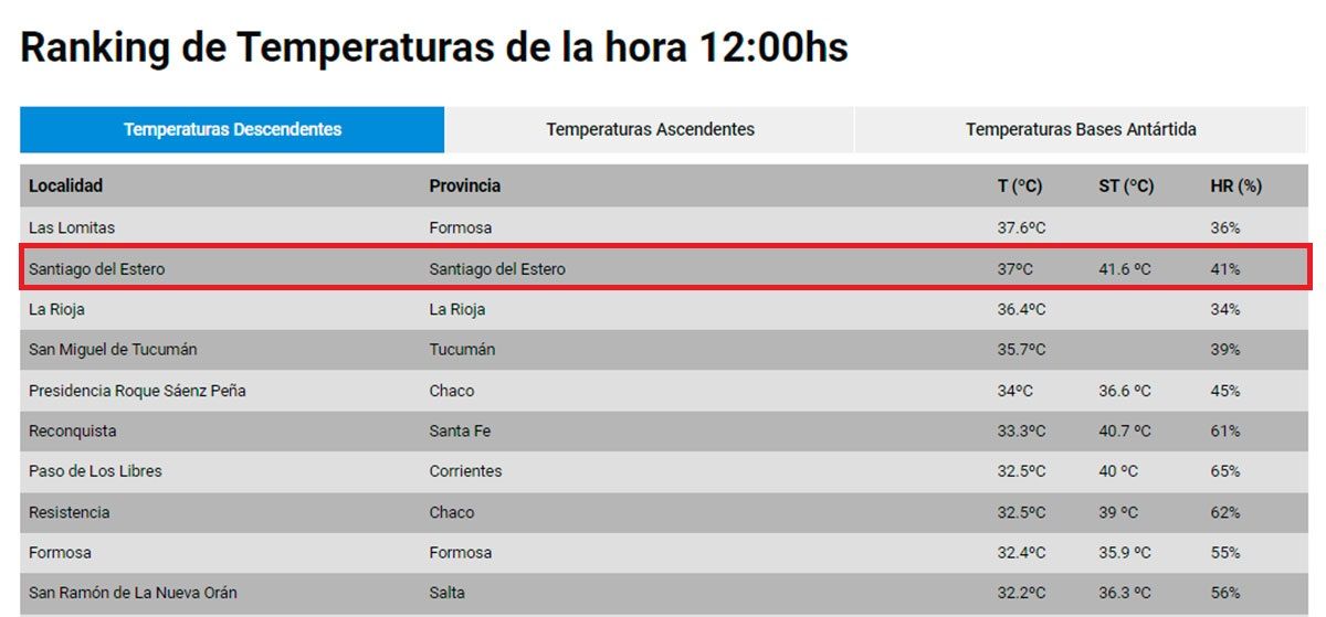 Con 41.7 grados de sensación térmica a las 12 del mediodía, Santiago del Estero encabeza el ranking de temperatura de las ciudades más calientes del país.