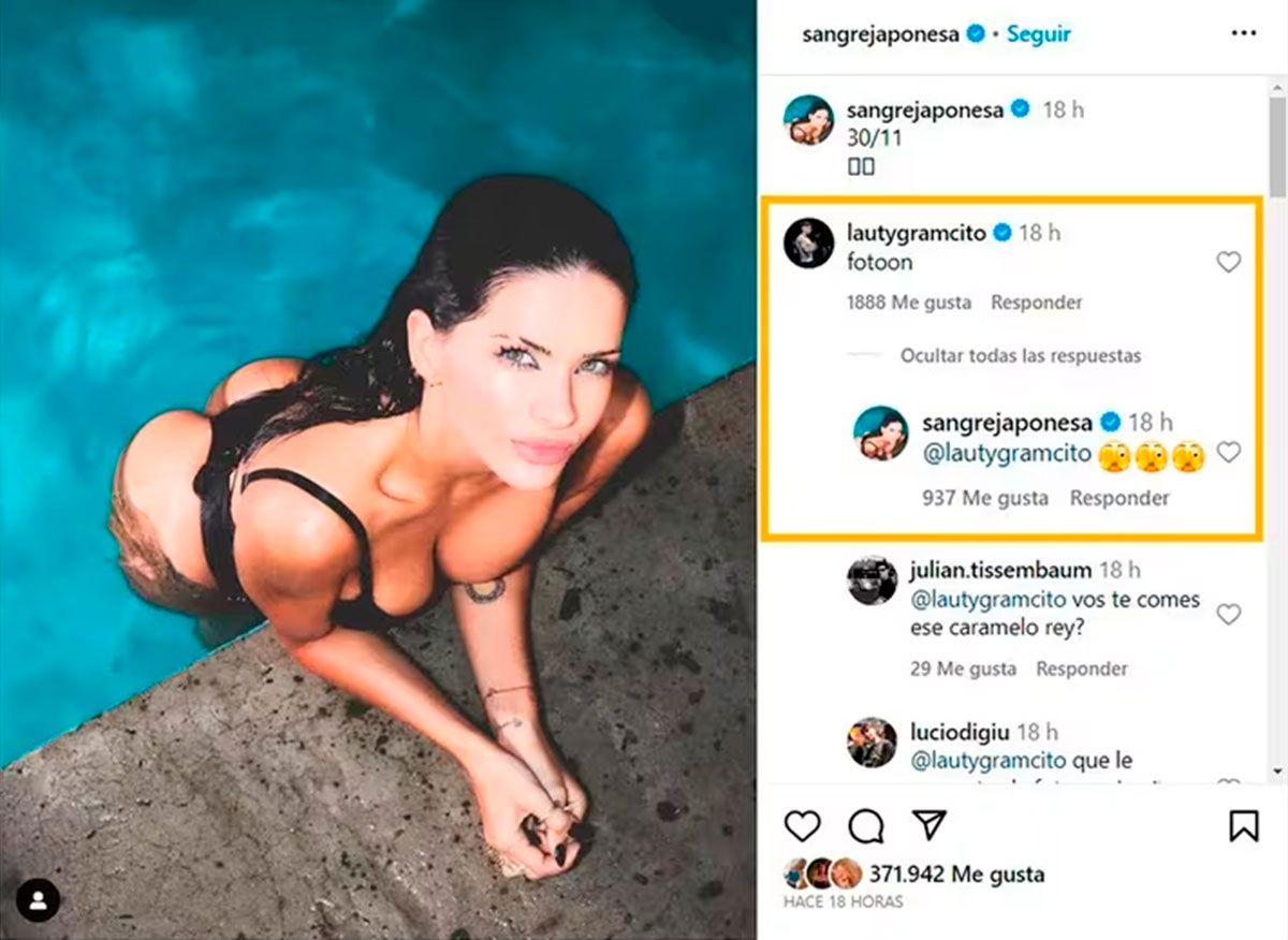 Como ocurre cada vez que sube contenido, sus seguidores se volcaron al posteo elogiando su belleza y aportando diferentes comentarios sobre la imagen. Y nuevamente volvió a aparecer Lauty Gram, con un mensaje que debido a la repercusión terminó casi convirtiéndose un posteo en sí mismo. “Fotón” escribió el influencer y la actriz le replicó multiplicando por tres el emoji del rostro con las manos tapándose los ojos.