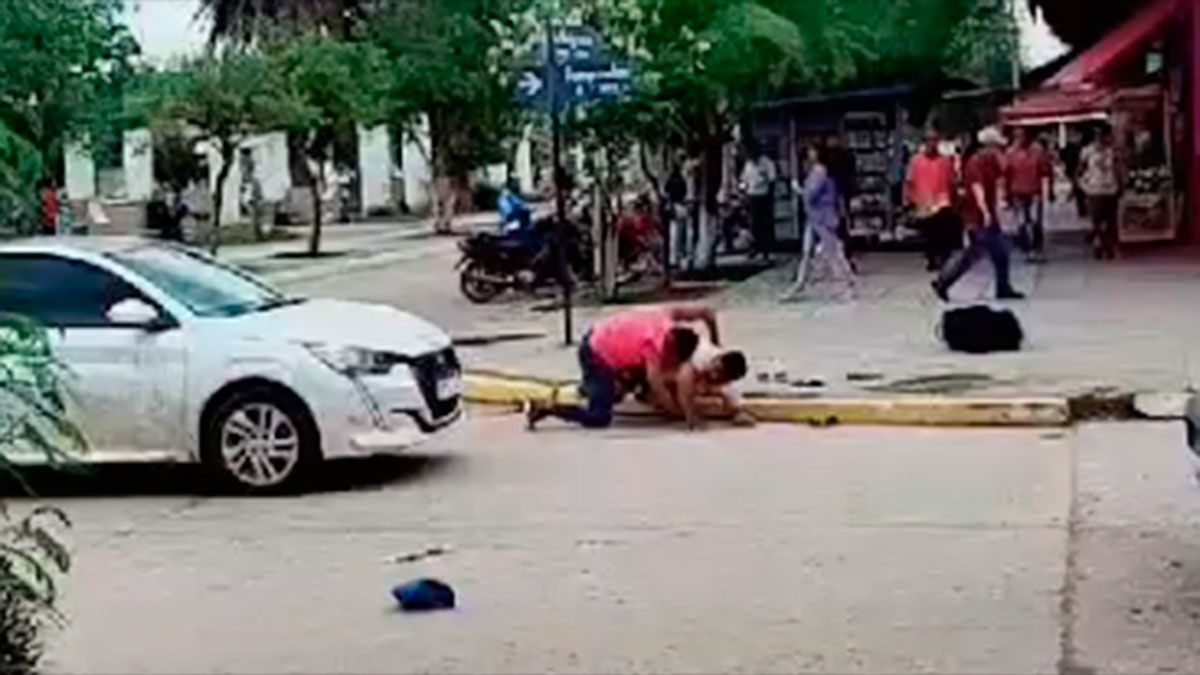 El inusual episodio se produjo en la intersección de avenida Belgrano y calle Pueyrredón, donde dos sujetos se trenzaron en una feroz pelea luego de mantener una discusión por diferencias de vieja data.