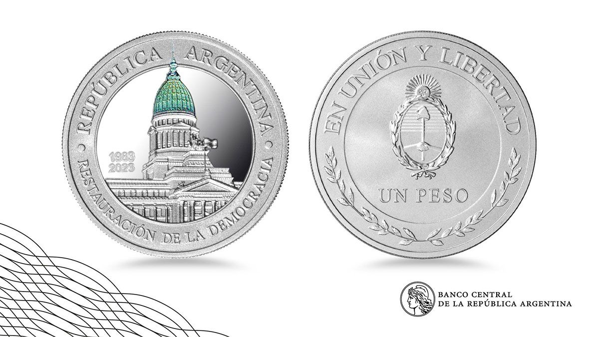La nueva moneda tiene inscripta los años 1983 y 2023 para recordar los años que ha tenido la Argentina de democracia ininterrumpida desde el último golpe militar.