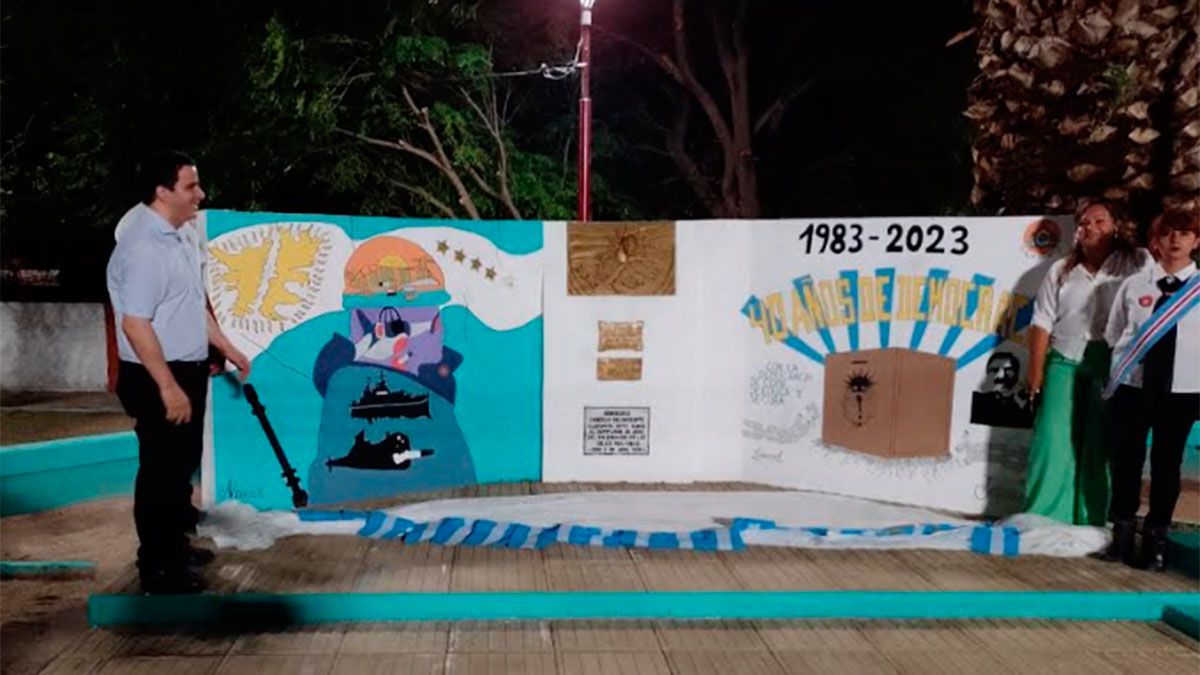 El intendente detalló que “se realizaron trabajos para revalorizar la plaza con iluminación, entapiado, un mapa de Malvinas y murales donde los jóvenes fueron los grandes protagonistas”.