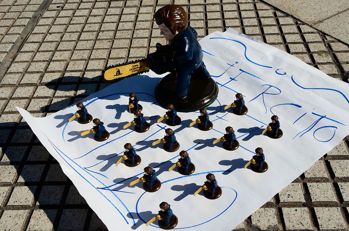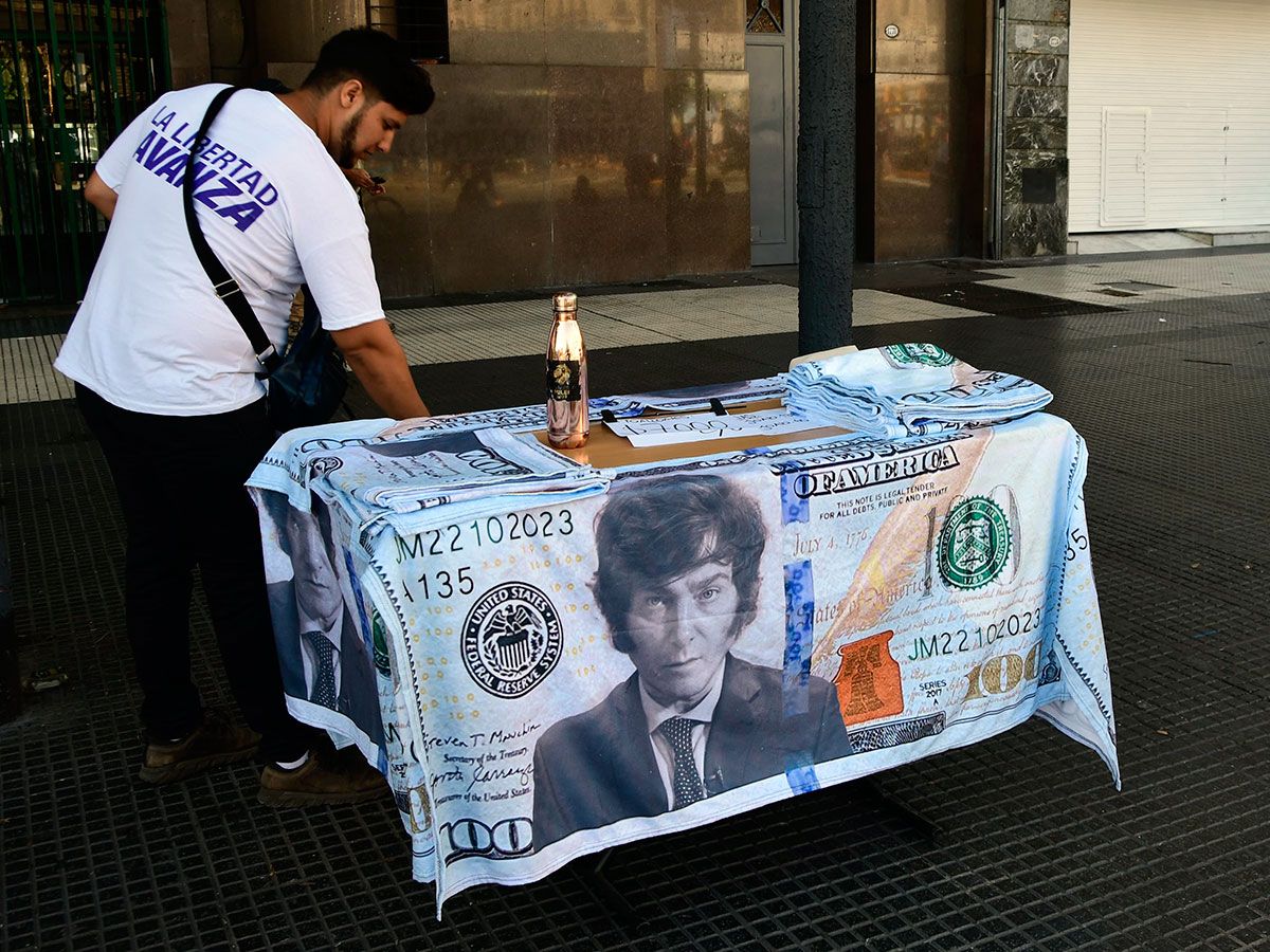También estuvieron a la orden del día los puestos improvisados de venta de productos comerciales alusivos a Milei, entre los que se destacó la venta de toallones playeros que simulaban un billete de 100 dólares estadounidenses con la cara del presidente argentino.