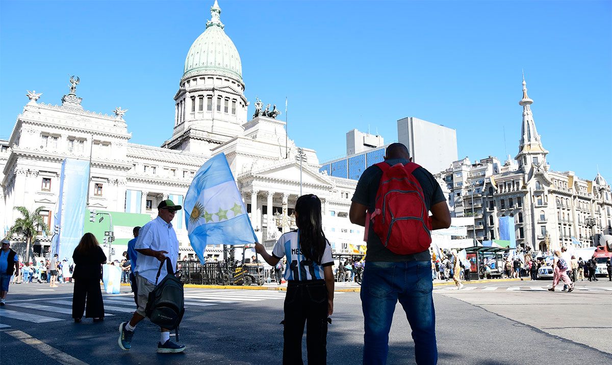 Ataviados con banderas argentinas y con la insignia de La Libertad Avanza (LLA), ciudadanos procedentes de distintos puntos del país se ubicaron en las inmediaciones del Parlamento, en la Plaza de los Dos Congresos de la ciudad de Buenos Aires, en medio del gran operativo de seguridad dispuesto para la ceremonia.