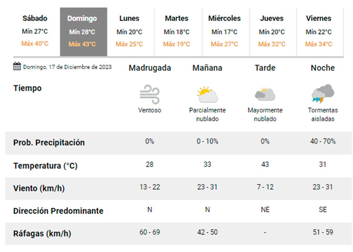 Cabe destacar que, según el pronóstico extendido, para este domingo se espera que la temperatura máxima llegue a los 43°. Como así también anuncian fuertes ráfagas de viento, mientras que para la noche llegarían las precipitaciones.