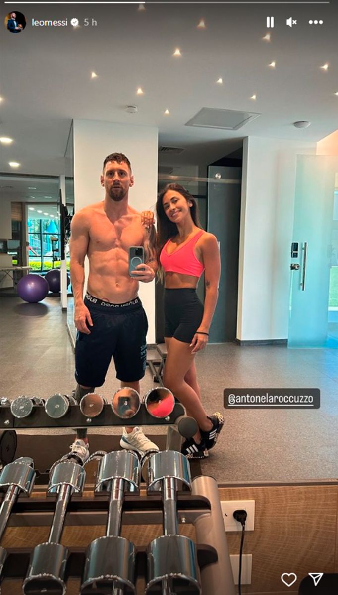 Messi, de 36 años, publicó una selfie en una historia de Instagram donde aparece con el torso desnudo, durante una jornada de ejercicios que contó con la compañía de Roccuzzo, a quien arrobó en la fotografía.