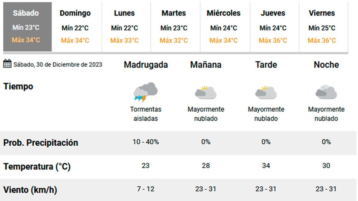 Las condiciones, precisa el organismo, serán idénticas para el domingo 31, día en el cual la mínima será de 22 grados y la máxima de 34.