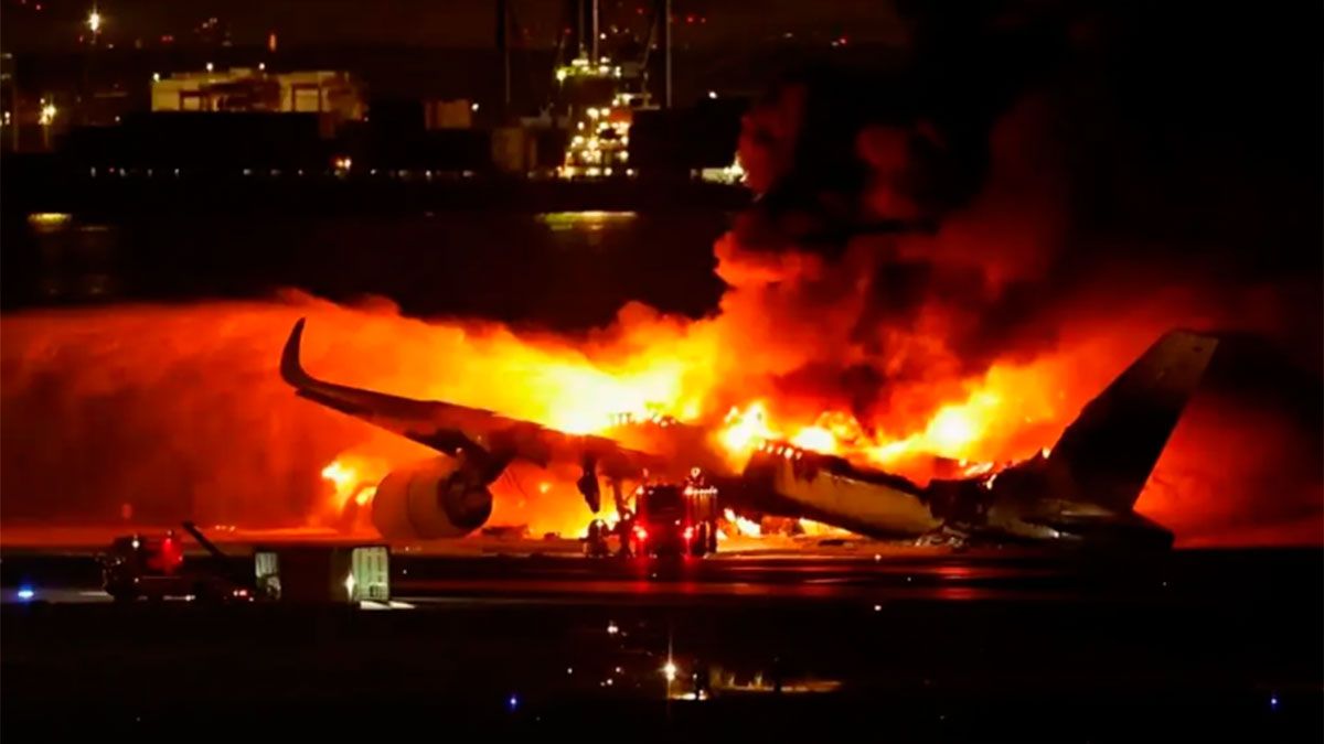 Las imágenes de la cadena NHK mostraban el avión, un Airbus A350, con llamas que salían debajo del fuselaje.