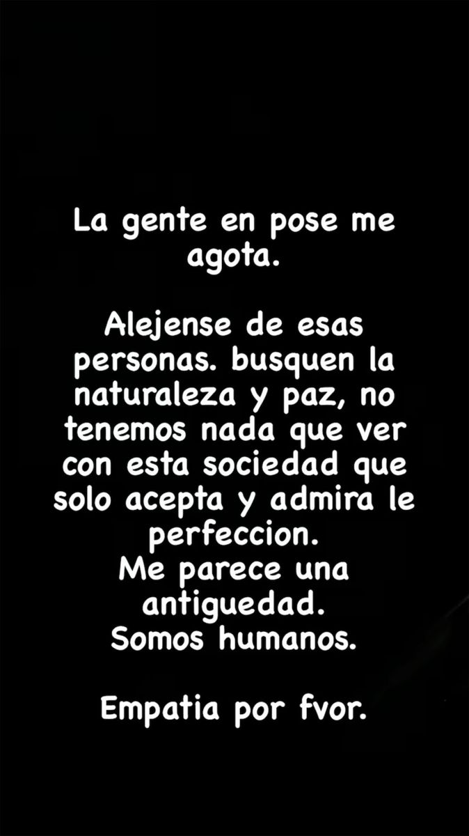 “Busquen la naturaleza y paz. No tenemos nada que ver con esta sociedad que solo acepta y admira la perfección”, prosiguió la influencer. Y concluyó: “Me parece una antigüedad. Somos seres humanos. Empatía, por favor”.