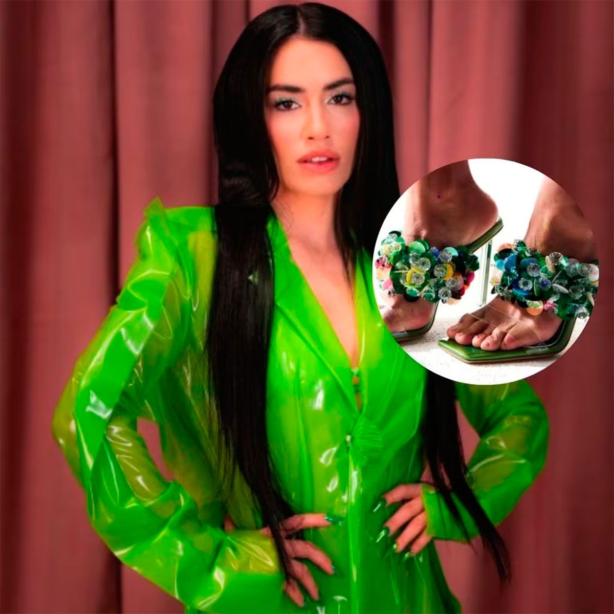 Luego enseñó unas sandalias influential green, que en una página de reventa cuestan alrededor de 100.000 pesos argentinos. Las mismas son de color verde y tienen un ramo de flores que cubre una de las tiras y la otra es transparente. Los mismos los usó con una camisa verde para el video “Mi Fiesta”.