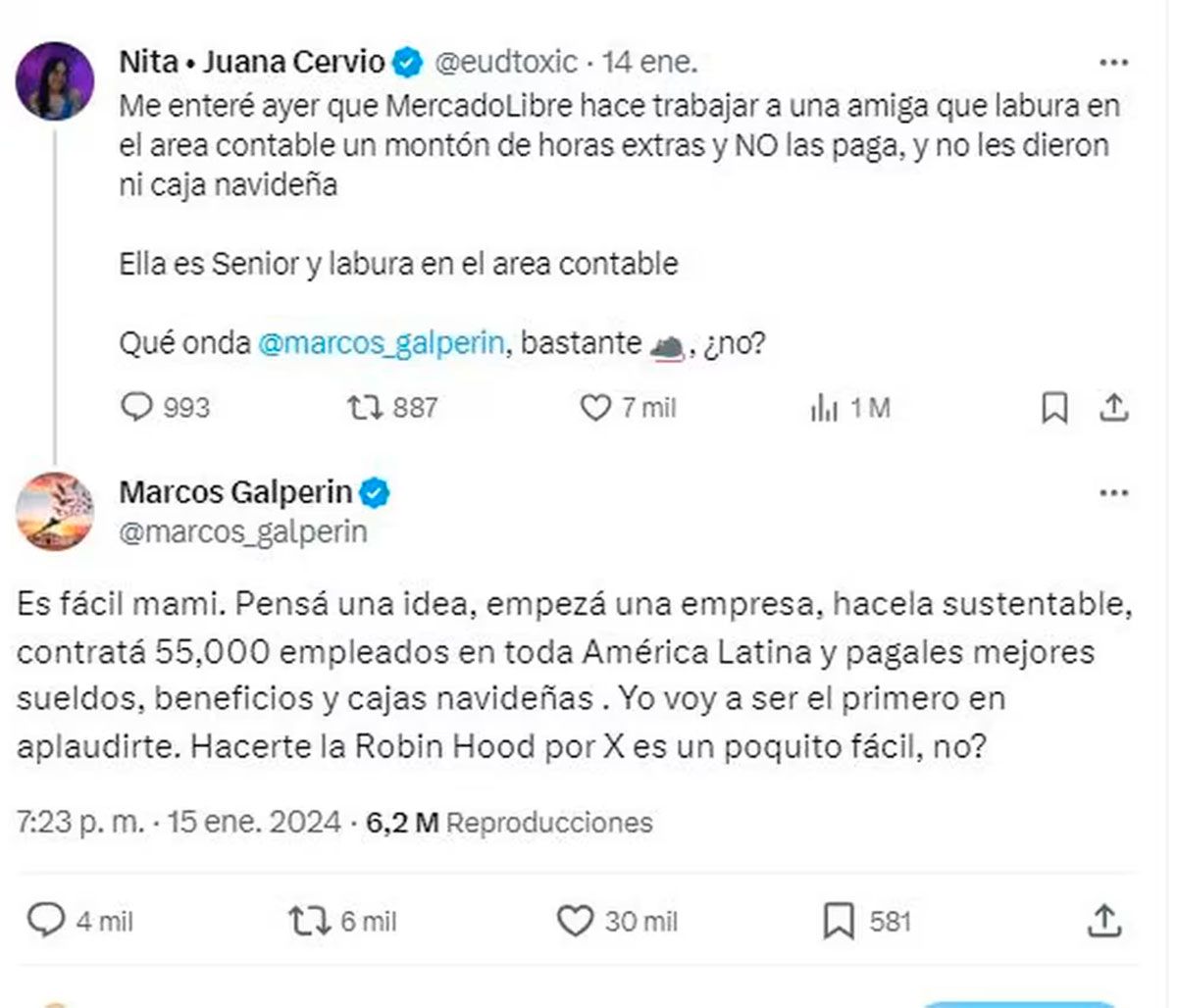 Todo comenzó el domingo pasado por la tarde cuando una usuaria de X, Juana Cervio, una joven reclutadora tech, escribió: “Me enteré ayer que MercadoLibre hace trabajar a una amiga que labura en el área contable un montón de horas extras y NO las paga, y no les dieron ni caja navideña. Ella es Senior y labura en el área contable. Qué onda Marcos Galperin, bastante (emoji de una rata), ¿no?”.
