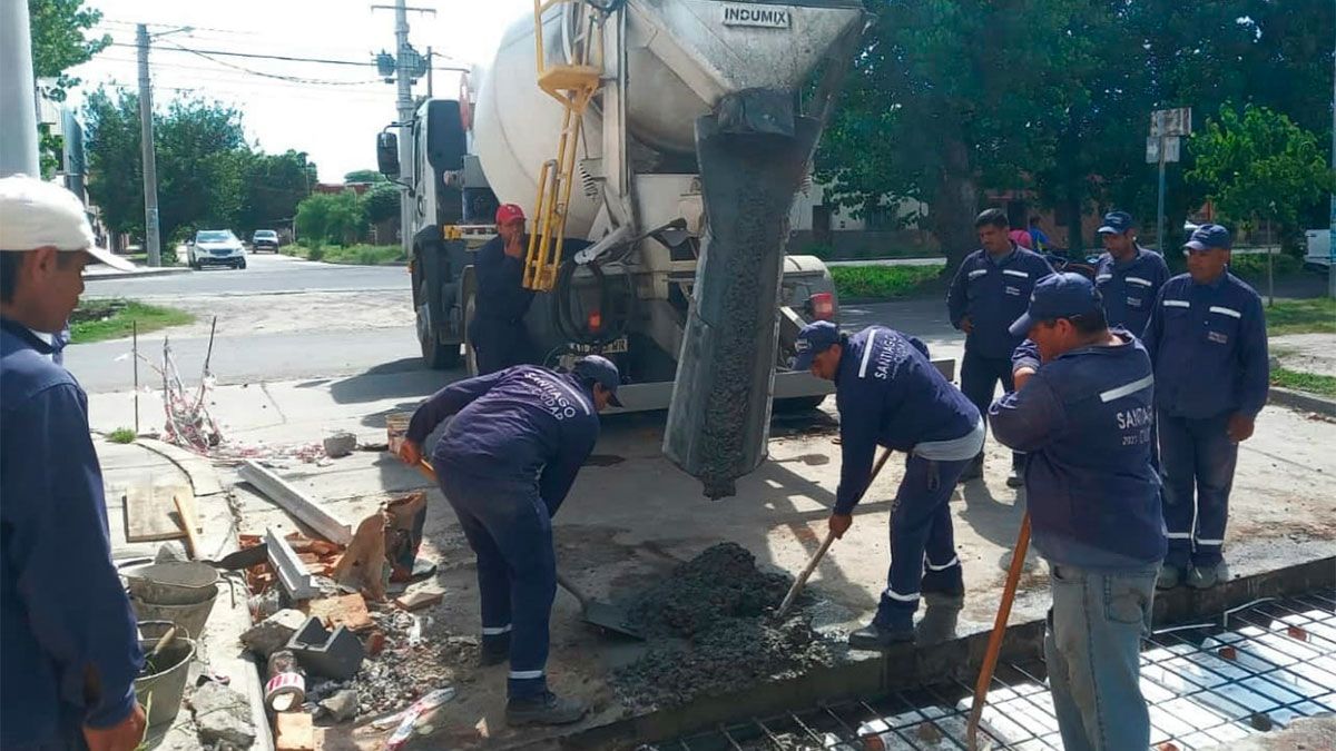 Empleados de la Dirección de Obras Públicas de la Municipalidad reemplazaron la reja alcantarilla ubicada en la intersección de las calles Yapeyú y Aguirre en el barrio San Martín por una nueva losa de hormigón armado.