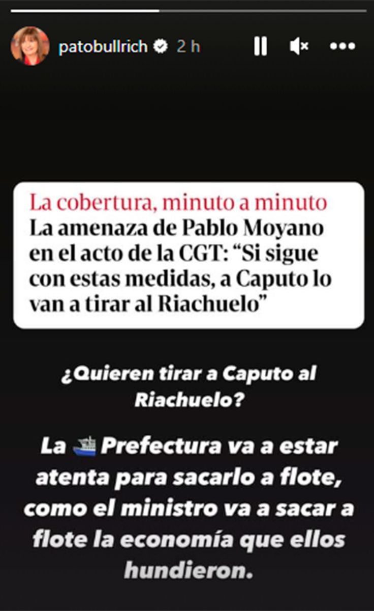 La ministra de Seguridad, Patricia Bullrich, también utilizó las redes sociales para responderle a Moyano. “¿Quieren tirar a Caputo al Riachuelo? La Prefectura lo va a sacar a flote”, escribió en Instagram.