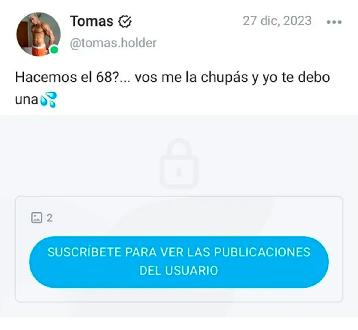 Tomás Holder, exparticipante de Gran Hermano 2022 y del Bailando 2023, decidió abrirse una cuenta en OnlyFans y dejo a todos boquiabiertos con su manera de presentar el contenido de alto voltaje. Si bien sufrió ataques de ansiedad mientras participaba en el programa de Marcelo Tinelli, en diciembre de 2023 confesó sin dar tanto detalle que estará nuevamente en un reality pero en España. El influencer decidió abrirse un perfil en la plataforma para adultos y en su descripción escribió: "Si te gusté cuando me viste por primera vez, cuando me conozcas por aquí no voy a salir de tu cabeza. Si no sabés regalarle una sonrisa a papi mejor ni te aparezcas… Y si sabés, mandame un DM para que veas como todo se puede calentar". Lo que llamó la atención fueron sus frases en cada contenido: "¿Jugamos al mago? Te echo un polvo y desaparezco"; "¿Hacemos el 68? Vos me la chup*s y yo te debo una...". Esto generó que comenzaran a atacarlo en la red social "X" y dijeron: "Ay no, por favor. ¿Quién le dijo que esto le iba a funcionar?; "Para mí los títulos se los dijo Chat GPT"; "Desleer", entre otros. El influencer arrancó en la plataforma con una oferta limitada del 85% de descuento durante 31 días por 3,75 dólares para poder ver todo su contenido. Luego, están los paquetes de suscripción de 3 meses con un total de 63.75 dólares, de 6 meses con un precio de 112,50 dólares y 12 meses con un total de 195 dólares.