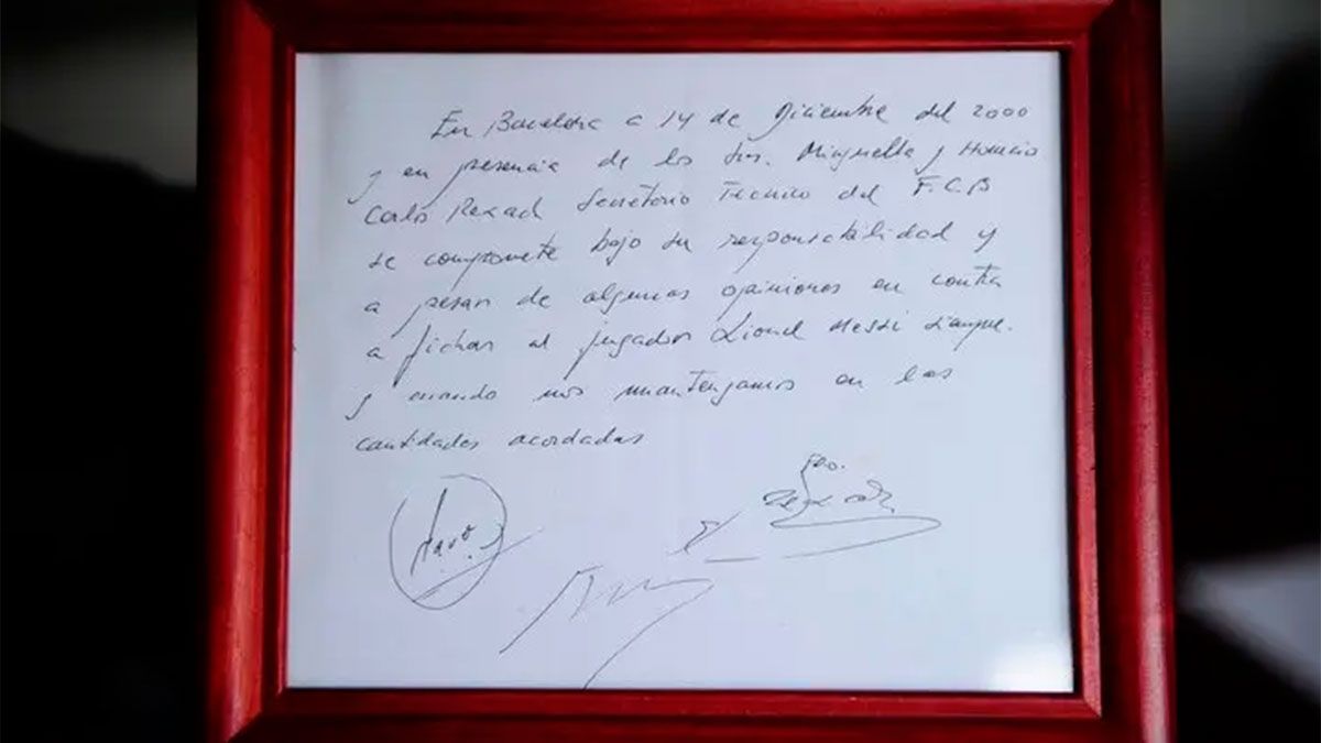 En dicha servilleta, ambas partes se comprometían a cumplir con el acuerdo pactado, y de esta forma la historia de amor entre Messi y el Barcelona comenzaba. Esto es lo que decía el pedazo de papel: "En Barcelona, a 14 de Diciembre del 2000 y en presencia de los Sres. Minguella y Horacio (Gaggioli), Carles Rexach, Secretario Técnico del F.C.B., se compromete bajo su responsabilidad y a pesar de algunas opiniones en contra a fichar al jugador Lionel Messi siempre y cuando nos mantengamos en las cantidades acordadas".
