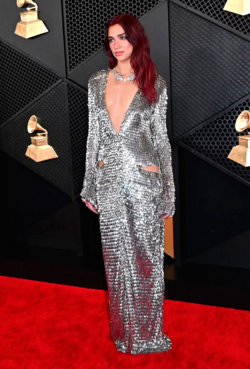 Dua Lipa fue la primera en pisar la alfombra roja de los Premios Grammy y, como siempre, lo hizo a puro lujo y estilo. La cantante se lució para las cámaras con un maxivestido de paillettes plateado. Es de la marca francesa Courreges.