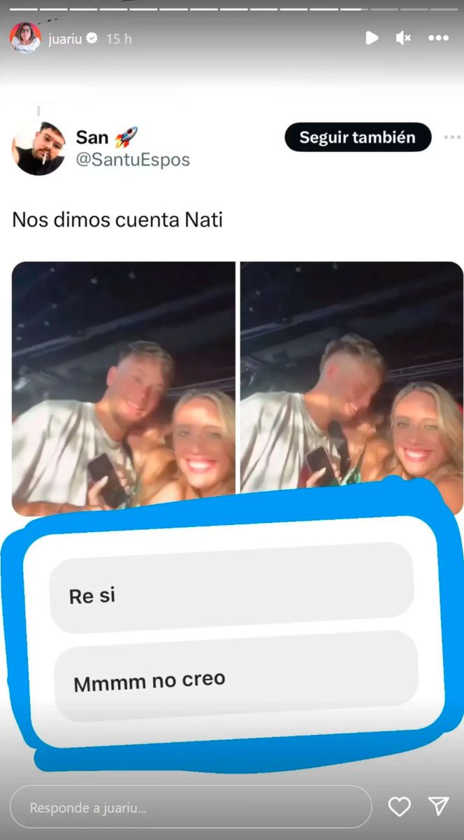 En sus historias en Instagram, Juariu reposteó la imagen del ex integrante del reality de Telefe junto a la sensual rubia. La panelista de Cortá por Lozano le preguntó a sus seguidores: "Re sí o Mmm... no creo".