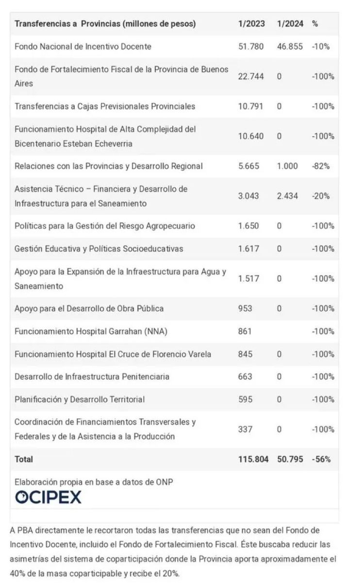 Según informó el sitio OCIPEX, el recorte a las provincias fue de un 56% en términos reales comparado con enero de 2023. Eliminaron las transferencias de recursos a cajas previsionales provinciales, infraestructura de hospitales, políticas educativas y penitenciarias, entre otros.