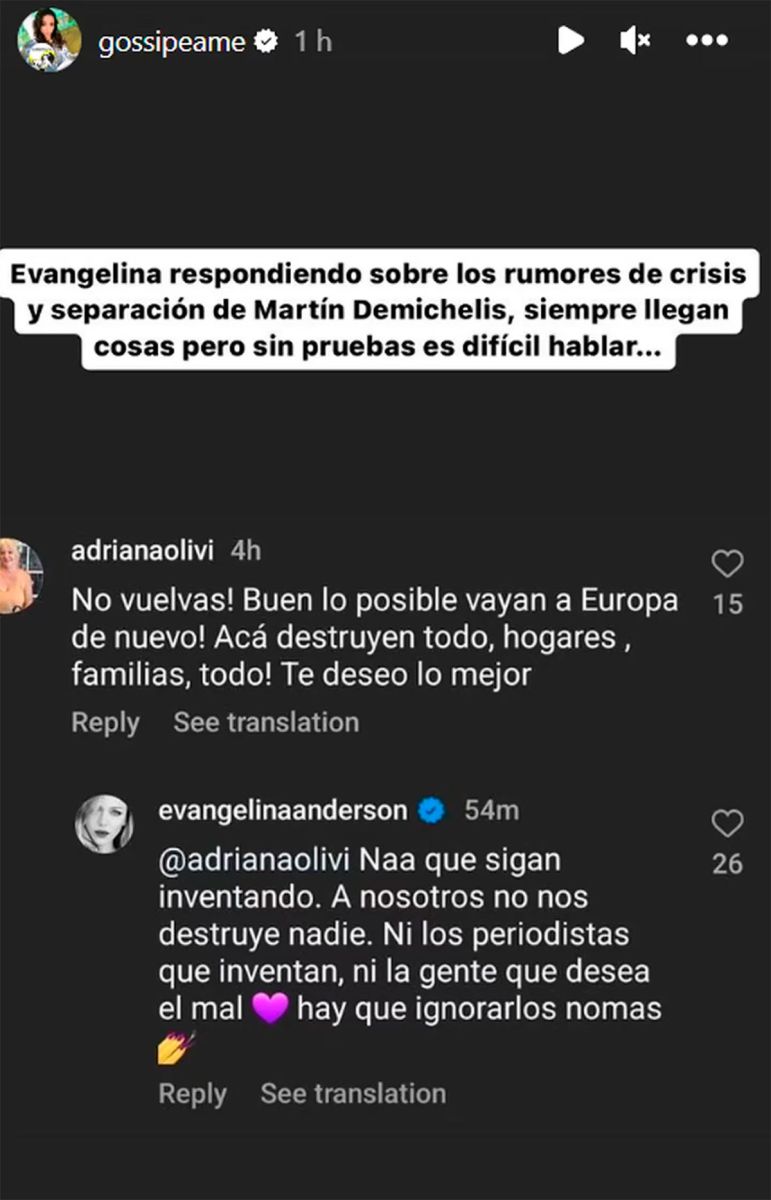 “¡No vuelvas! En lo posible váyanse a Europa de nuevo. Acá destruyen todo, hogares, familias, todo. ¡Te deseo lo mejor!”, expuso la usuaria. Y, muy atenta a los comentarios, Eva contestó: “Naa... que sigan inventando. A nosotros no nos destruye nadie. Ni los periodistas que inventan ni la gente que desea el mal. Hay que ignorarlos nomás”.