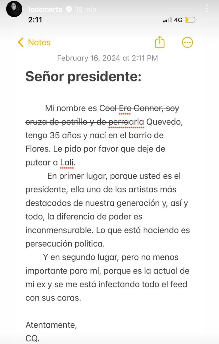 La actriz escribió una nota en su celular que después compartió en sus historias de Instagram. “Querido presidente: mi nombre es Carla Quevedo, tengo 35 años y nací en el barrio de Flores. Le pido por favor que deje de putear a Lali”, expresó en el primer párrafo.