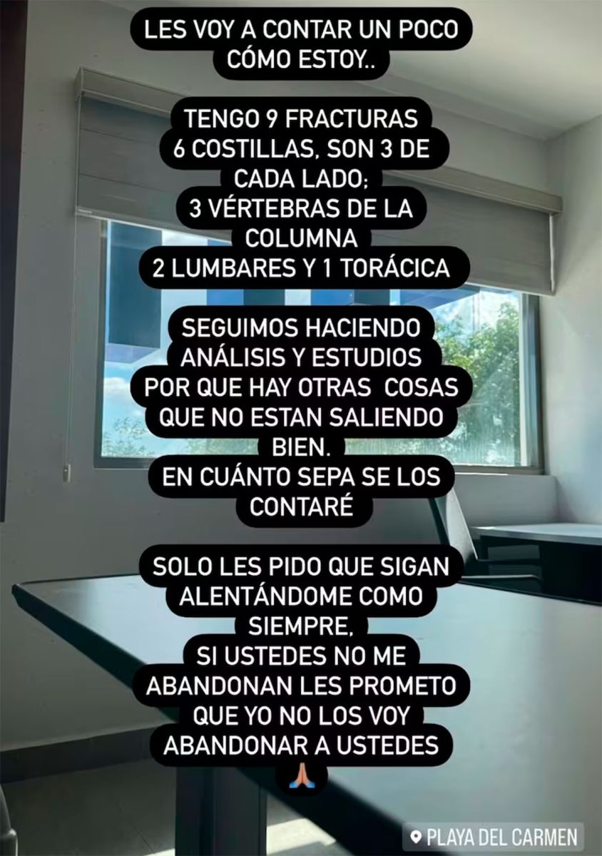 “Tengo nueve fracturas, seis de costillas, son tres de cada lados. Tres vértebras de la columna de la columna, dos lumbares y una torácica. Seguimos haciendo análisis y estudios porque hay otras cosas que no están saliendo bien. En cuánto sepa se los contaré”, contó Figallo. Y agregó: “Solo les pido que sigan alentándome como siempre. Si ustedes no me abandonan, les prometo que yo no los voy a abandonar”.