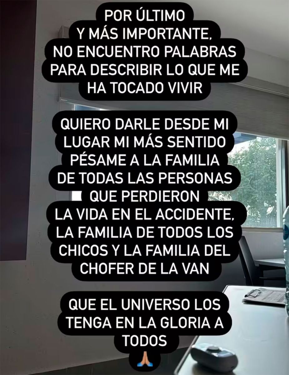 Sobre el siniestro vial, definió: “No encuentro palabras para describir lo que me ha tocado vivir. Quiero dar desde mi lugar mi más sentido pésame a la familia de todas las personas que perdieron la vida en el accidente. La familia de todos los chicos y del chofer de la van. Que el universo los tenga en la gloria a todos”, dijo.