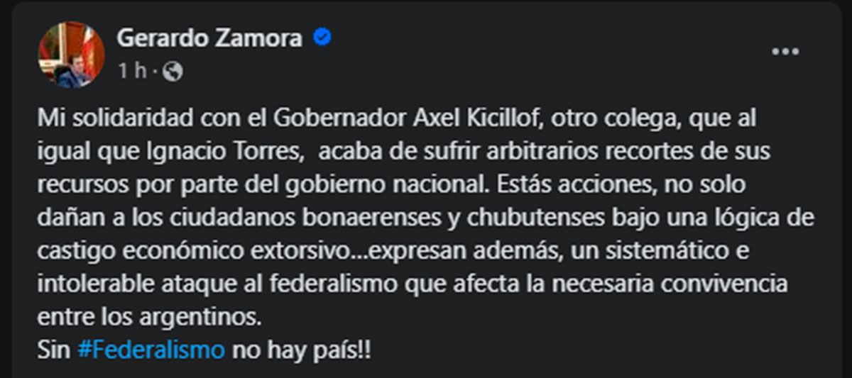 En este contexto, el gobernador de la provincia, Dr. Gerardo Zamora, se expresó a través de sus redes sociales para manifestar su solidaridad con el mandatario bonaerense, Axel Kicillof, al igual que como lo hizo con su par de Chubut, Lic. Ignacio Torres.