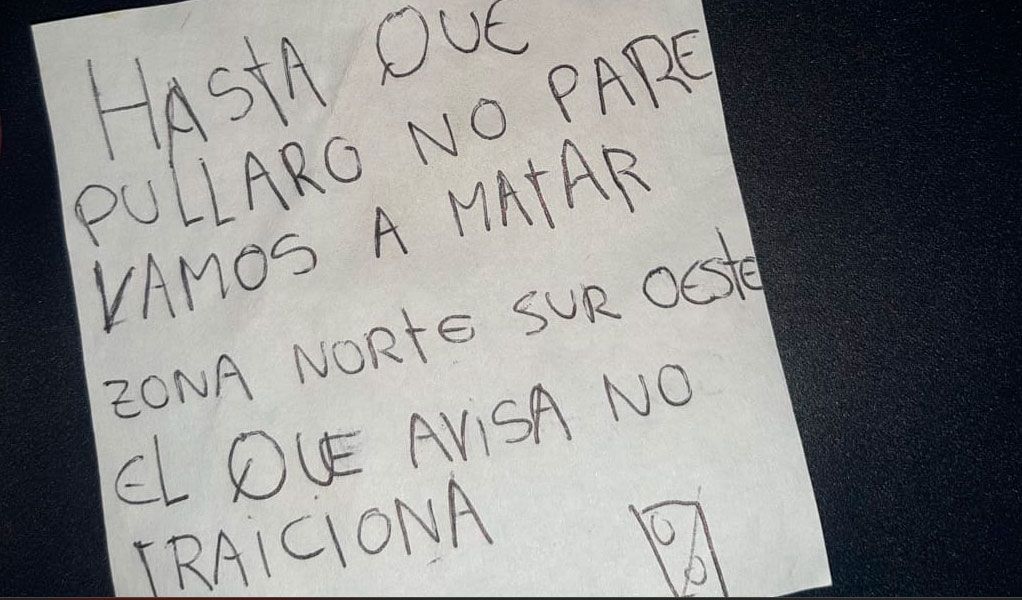 El mensaje, que ilustra esta nota, dice: “Hasta que Pullaro no pare vamos a matar. Zona norte sur oeste. El que avisa no traiciona”. Debajo, se encuentra un diagrama, que parece ser una ficha de dominó tachada, con dos círculos.