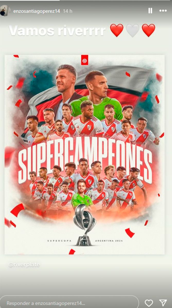 Pasada una noche intensa, emotiva y festiva para todo River tras consagrarse en la Supercopa Argentina, las redes sociales se inundaron de festejos, como si fuera una suerte de desahogo por lo complicada que venía la mano luego del gol tempranero de Estudiantes. Y entre esos tantos usuarios que se manifestaron, incluidos varios jugadores del plantel, apareció el hijo de Enzo Pérez, justamente a quien ayer le tocó defender la camiseta rival en una jornada más que especial.