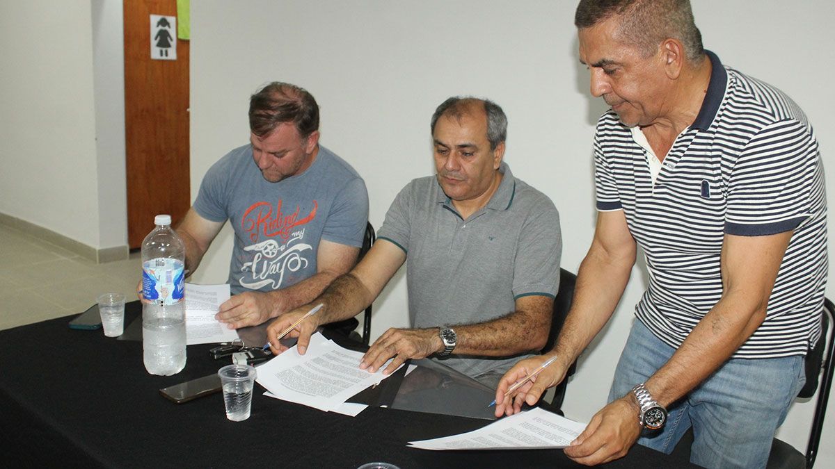 La rúbrica del acuerdo estuvo encabezada por el jefe del gobierno municipal, profesor Ángel Iñiguez, junto a Ariel Rubio, por la Liga local y Francisco Pece, vicepresidente de la Federación de Futbol Santiagueña.