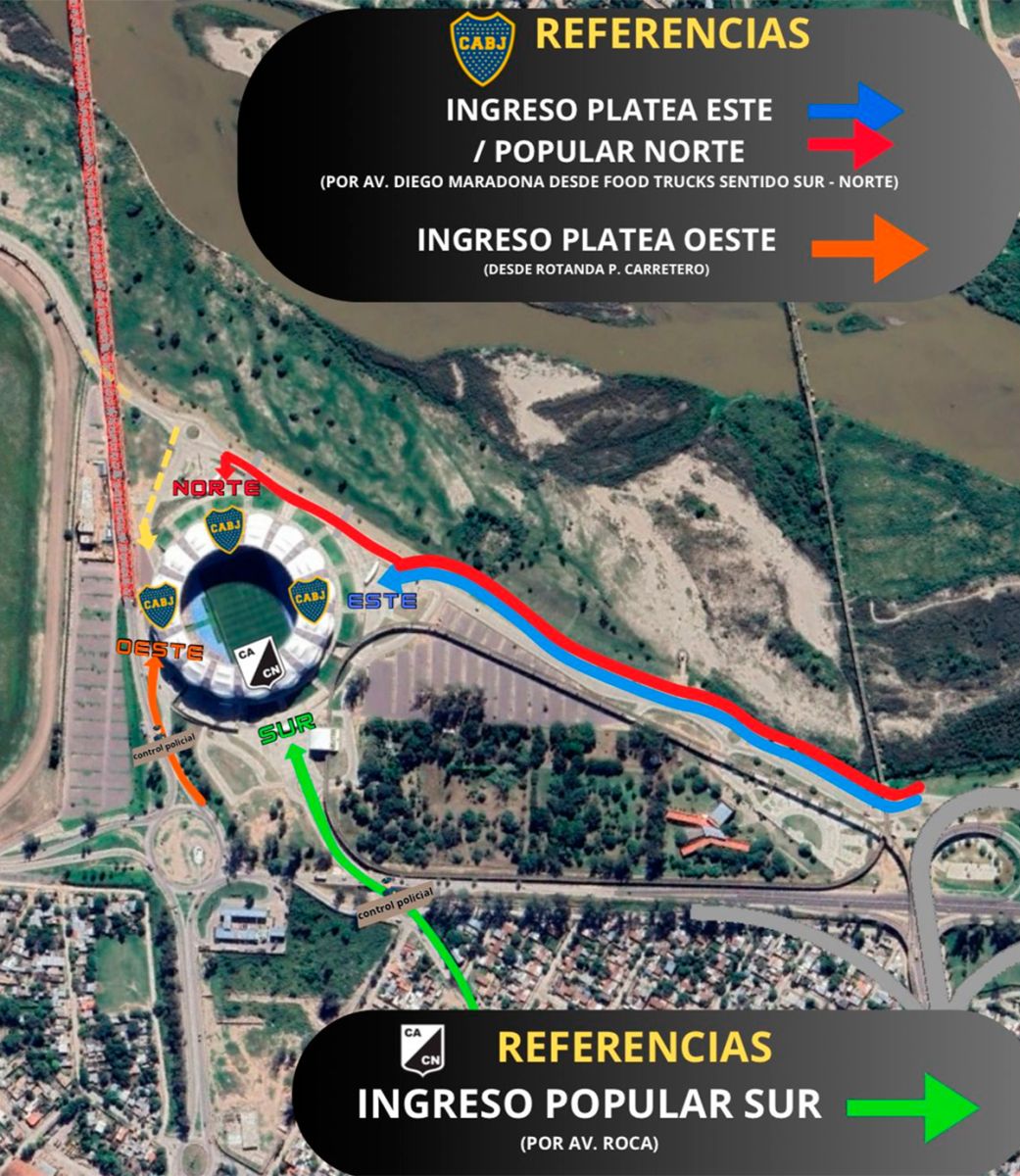 Los simpatizantes de Boca ingresarán a la platea Este y popular Norte por avenida Diego Maradona. Los que se ubiquen en la platea Oeste lo harán por la rotonda del Puente Carretero.