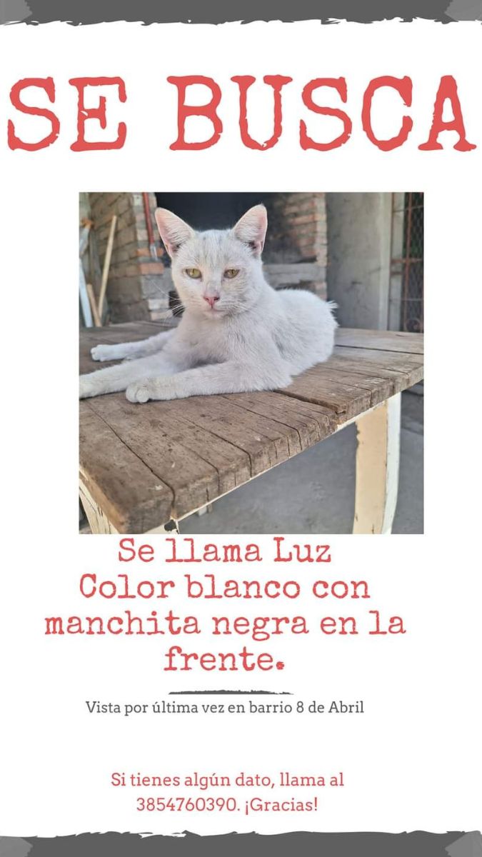 Buscan dar con el paradero de una gatita color blanco con una manchita negra en la frente llamada "Luz". Fue vista por última vez en el barrio 8 de abril.