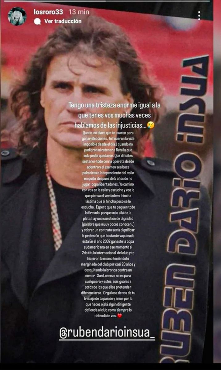 Además, la esposa del experimentado entrenador destacó lo hecho por Insua en el pasado: “En el año 2002 ganaste la Copa Sudamericana, en ese momento el segundo título internacional del club, y te hicieron lo mismo teniéndote marginado por casi 20 años y desquitando la bronca con un menor”.