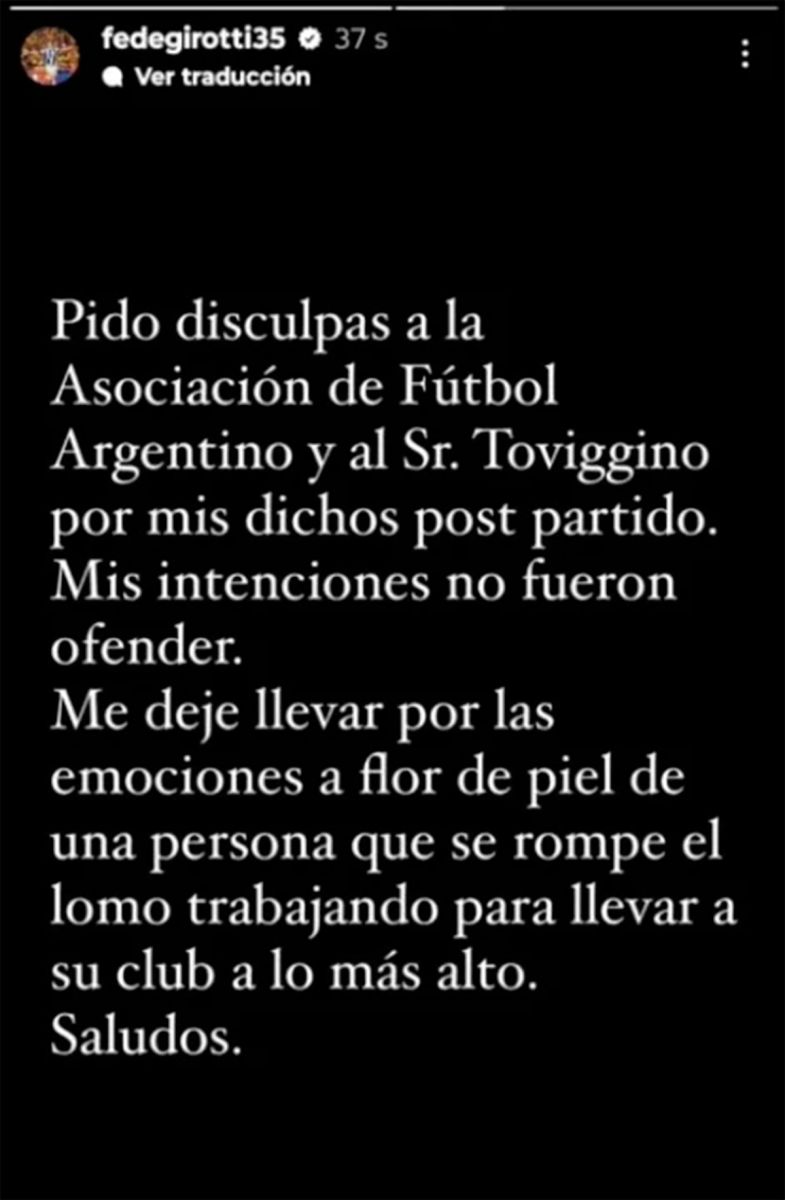 “Pido disculpas a la Asociación del Fútbol Argentino y al Sr. Toviggino por mis dichos post partido. Mis intenciones no fueron ofender. Me dejé llevar por las emociones a flor de piel de una persona que se rompe el lomo trabajando para llevar a su club a lo más alto. Saludos”, fueron las palabras de Girotti en sus redes sociales.