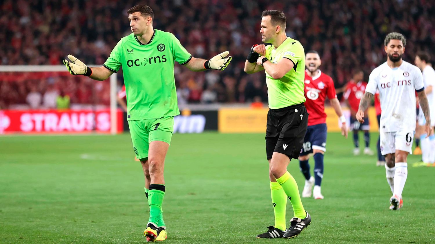 A pesar de no ser expulsado, el arquero campeón del mundo en Qatar 2022 recibió su castigo: se perderá el próximo partido de Aston Villa, la ida de la semifinal contra Olympiakos en Birmingham, por acumular tres tarjetas en dos partidos consecutivos.
